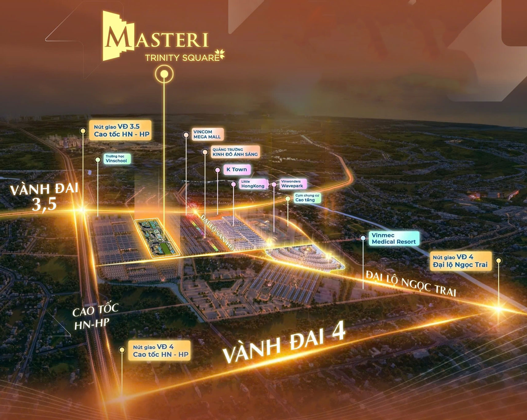Dự án toạ lạc tại vị trí trung tâm nhất của hợp điểm tam giác kinh tế vàng phía Đông Hà Nội – khu vực đang đón sóng đô thị hóa mạnh mẽ và định hướng trở thành cực tăng trưởng chiến lược, dễ dàng tiếp cận và kết nối đa chiều liên vùng với các tỉnh thành trọng điểm như Hải Phòng, Quảng Ninh, Ninh Bình,… mở ra tiềm năng mở rộng giao thương và gia tăng giá trị bất động sản bền vững.